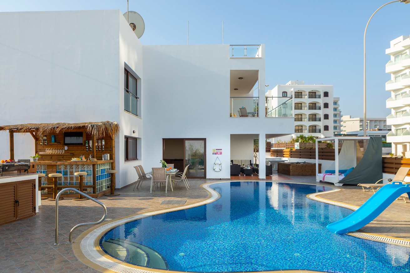 A majestic 5-bedroom villa with a swimming pool, jacuzzi, and sauna at the BEST location in Protaras. We are located 1 minute's walk from the seafront and in between 2 amazing beaches: Sunrise beach and the award-winning Fig Tree Bay. Simultaneously, our complex is located 30 seconds away from the main Protaras strip. Suitable for groups, couples, and families. The villa is tastefully furnished and fully equipped, with an amazing view of the Mediterranean Sea. All rooms are fully air-conditioned with high-speed internet. We take pride in allowing our guests to feel that they are on a unforgettable holiday under the sun and providing amenities even for the most demanding visitors. This villa apart from a private pool includes: a personal Hot tub, an indoor sauna, a private outdoor bar, outdoor barbecue grill, sunbeds, kids trampoline, ping pong table, an arcade video game machine, an arcade basketball machine, an air-hockey, a football table, a speaker and a satellite smart TV(with Netflix and channels from over 10 countries).